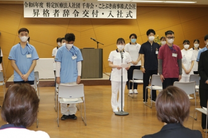 新入職員を代表して挨拶に立った看護師の金谷優華さんは、千葉理事長からのメッセージを胸に日々精進して行きたいと述べました。また、ベトナム人特定技能(介護)就職者のグエン ドゥック カム ホアさんは「介護と医療の理解を深め、法人の発展に貢献できるよう頑張ります」と決意を述べました。