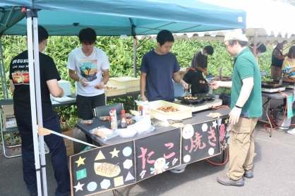 また、露店が多く立ち並び、アツアツのたこ焼きやひんやりおいしいかき氷などを販売。就労支援センター・ピアチェーレからは焼き立てパンのほか、新しくクリームソーダをメニューに加え、患者様も職員もレクリエーションとともに楽しみました。恒例の盆踊りでは今年から太鼓の体験を追加し、患者様が叩く太鼓の音に合わせて踊りました。