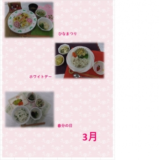 3月のおひなさまにはちらし寿司、ホワイトデーにはバターライスとグラタンの盛り合わせといちごのデザート、春分の日にはグリンピースごはんと赤魚のうぐいす焼きを提供いたしました。