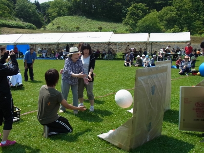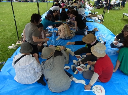 天候にも恵まれ100名を超えるたくさんの患者様の参加がありました。参加された方々からは「自然に囲まれ、外の空気を吸いながら食べるとおいしいね」とジンギスカンの鍋を囲み、野外での食事にみなさん楽しそうに舌鼓を打たれていました。食事の後には、OTスタッフを中心にアトラクションが行われ、緑に囲まれた中でみなさん楽しい1日を過ごされていました。
