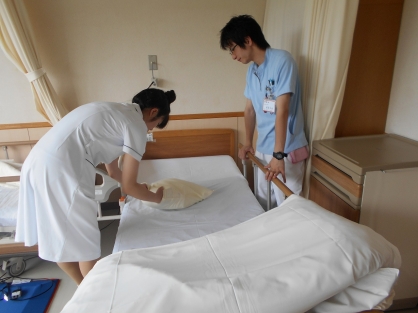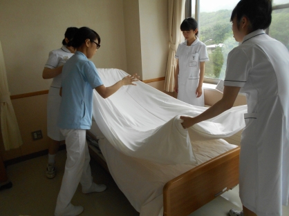 認知症病棟で、洗面介助・ラジオ体操・検査の引率、誘導・食事の配膳の介助・ホーフ交換・レクリェーション参加などの体験実習をしていただきました。