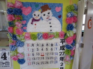 今月は冬の寒い時期ということで、雪だるまを テーマにしました。 体の雪部分はワタを使用し作成、かわいく完成しました