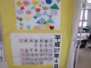 今月のカレンダーは 折り紙で「犬・魚・車」等を作ってもらいました みなさん折り紙を懐かしみ、楽しく完成しました