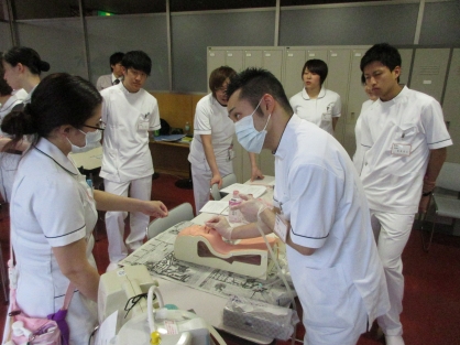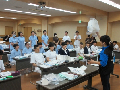 1日目の研修は、社会人の心構え、職務基準について、教育、医療安全についての講義や接遇、BLS、食事介助など演習を含めた研修が行われました。2日目は、感染、NST、褥瘡、行動制限、オムツ、CVPPP、の研修を行い、3日目は、看護師、ケアワーカーに分かれ、看護師は採血、導尿など、ケアワーカーはベッドメイキング、体位変換などの技術研修をそれぞれ行いました。初日から皆さん緊張した面持ちでしたが、各種の研修に参加していました。