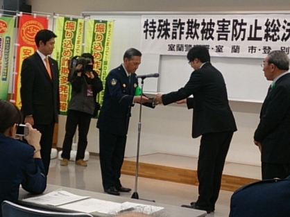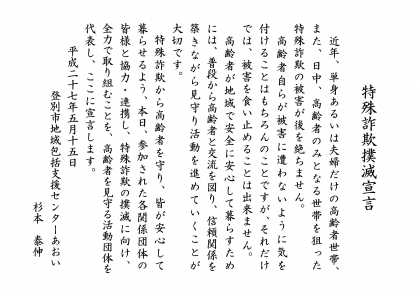 そんな現状を鑑み被害を未然に防ぐことで犯罪等を撲滅することを目的に開催された「特殊詐欺被害防止総決起集会」に包括あおいの職員が参加し、高齢者を見守る活動団体を代表して「特殊詐欺撲滅宣言」を行ってきました。