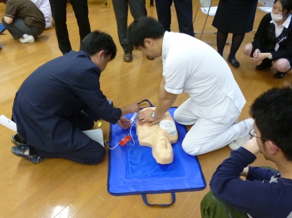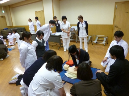 平成27年5月20日に、コメディカル・事務部門を対象とした新人職員救急救命講習会が行われました。一次救命処置を目的とした心肺蘇生法、AED、窒息の対応をパワーポイントで講義を受けた後、3グループに分かれて一連の流れを実際に体験してもらいました。今回は臨床に立ち会う機会が少ない部門が多い参加でしたが、実践を予定しての訓練を行い、緊急対応についての心構えと自信につながったようです。