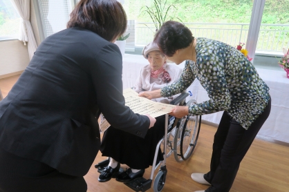 平成27年9月18日(金曜日)介護老人保健施設グリーンコート三愛にて、今年100歳になる利用者様が内閣総理大臣より表彰を受けました。