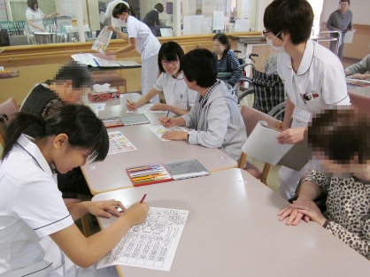 このうち西館4階の精神療養病棟ではフロアの説明を受けた後、習得した手洗いを早速実践し病棟内へ。最初は緊張した面持ちでしたが、作業療法のプログラム「ぬり絵」を患者さんと会話をしながら楽しむことで緊張がほぐれ、徐々に笑顔が増えてきました。