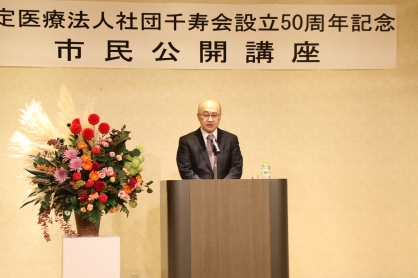 講演に先立ち、理事長・千葉泰二が50周年を迎えるにあたり関係団体、地域の皆様、従業員に対して感謝の意を表し、「将来の人口減少や少子高齢化問題など医療・介護を取り巻く環境は厳しい状況にありますが、この地域に貢献できる法人として成長いきたい」と決意を述べました。