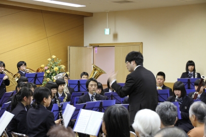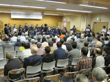 看護部レクリエーション委員会主催による「平成27年 三愛病院クリスマスコンサート」が12月10日(木)に行われました。北海道大谷室蘭高等学校の吹奏楽部38人をお招きし定番のクリスマスソングをはじめ、患者さんや利用者さんが慣れ親しんでいる「上を向いて歩こう」や『伝説の「演歌」メドレー』など7曲を演奏していただきました。
