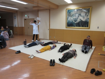 自律訓練法のお話では講義だけではなく実際に体験もしてもらいました。自律訓練法とは、心療内科や精神科などでも使われるものであり、慣れればいつでもどこでも数分で心身をリラックスさせることができる一種の自己催眠法です。みなさん思い思いに椅子に座ったまま行ったり、マットを敷いた上に横になって行う方もいらっしゃいました。