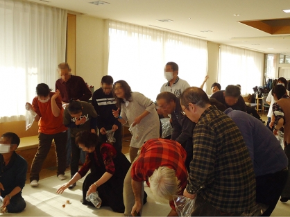 豆まきでは、年男年女の利用者さんが豆と一緒にお菓子や豪華賞品が当たるお楽しみ券を撒いたり、恒例の鬼退治も行われ、好評のうちに終えることができました。