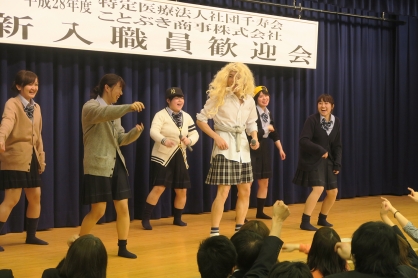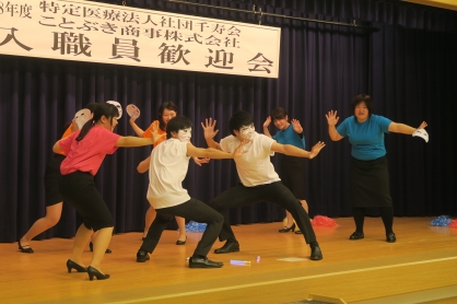 先輩職員が見守る中、新入職員を代表して薬剤師の高橋沙也佳さんが「不慣れな点もありますが、1日でも早く皆さんの役に立てるように頑張ります」と決意を表明しました。この後、新入職員がグループに分かれて歌やダンスなどの余興を行い、会場を大いに盛り上げました。