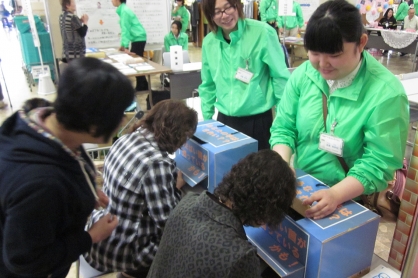 看護部や栄養課、相談室では相談や各種測定をはじめ、手洗いチェッカー体験などを実施。デイケアや作業療法では患者さんが製作した手工芸作品の展示やプレゼントなどを行いました。また、院内のイベントでは院内保育園の園児が外来や病棟を回り、来院された方や患者さんにティッシュを配布させていただきました。アーニスでは、ことぶき商事㈱による介護用品の紹介のほか、登別市社会福祉協議会と連携し授産品販売も行われ、就労支援センター・ピアチェーレではパンを販売させていただくなど様々な活動を通して当院の役割をアピールさせていただきました。