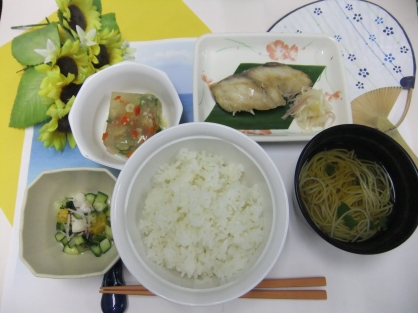 スズキの照り焼きをメインに・彩夏野菜のゼリー寄せ・菜果なます等 夏が旬の食材で構成、見た目も涼しく口当たりが良いと好評でした。