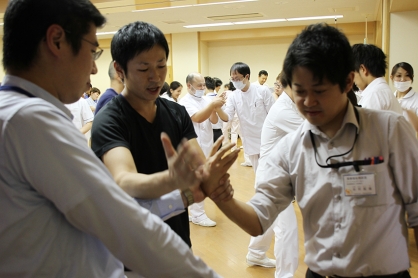 患者さんからの暴力や攻撃性を如何に防止しケアするためのプログラムで、専門の研修会を受講した施設内トレーナー(現在4名)が講師となり、どのように適切に関わるかという視点でリスクアセスメントから身体介入までを指導を行いました。受講者は2人1組で「両手で手首をつかまれた場合」「蹴られた場合」など具体的な対処手順を学習し、周囲に危険が及ばないよう防ぐ方法を学びました。
