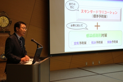 職員はこれから本格的なシーズンを迎えるインフルエンザの話に真剣に耳を傾け、感染症対策の意識の高さが感じられた研修会となりました。当院では院内感染に関する研修を定期的に開催し、患者さんを感染症から守るために日々努力していきます。