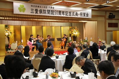 引き続き行われた祝賀会は鏡開きで開宴し、「三愛病院50年の軌跡」と題したDVDの上映を行ったほか、及川博史ストリングカルテッドによる「弦楽四重奏の調べ」に耳を傾けながら、出席者の皆さんは歓談に花を咲かせていました。