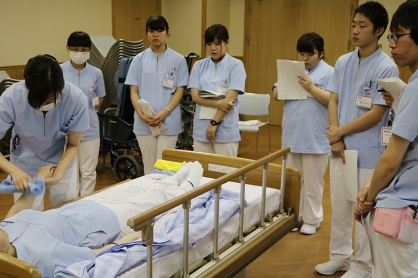 3日目はそれぞれ職種別に分かれ、看護師は採血や口腔・鼻腔吸引、ケアワーカーはベッドメイキングや体位変換などの技術研修を行いました。また、今年度から医師や看護師をサポートする「クラーク」を病棟に配置するにあたり、3名の新入職員が基本的な業務について学びました。