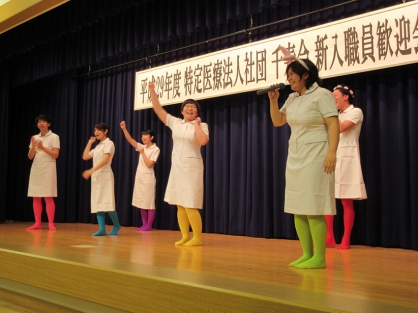 先輩職員が見守る中、新入職員を代表して作業療法士の田中志穂さんが「早く職場に慣れように頑張ります」と決意を表明しました。この後、新入職員がグループに分かれて歌やダンスなどの余興を行い、会場を大いに盛り上げました。
