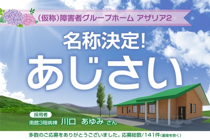 12月開設に向けて工事を進めている(仮称)障害者グループホームアザリア2の名称が「あじさい」に決定しました。当法人の職員から名称を募り、141件(重複を除く)の中から「家族団らん」や「家族の結びつき」といった花言葉を持つ「あじさい」が選ばれ、命名した南館3階病棟の川口あゆみさんに金一封が進呈されました。
