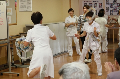 歌や踊りでは患者さんからどちらが楽しかったかを評価してもらったほか、人間輪投げでは頭に輪が的中する度に拍手や歓声が上がるなど、患者さんに楽しんでもらえた鑑賞会となりました。
