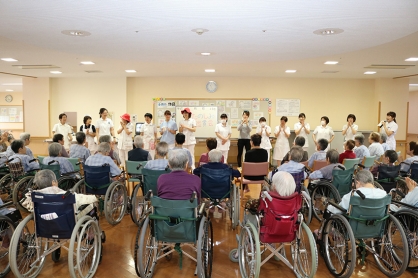 入院患者さんに楽しんでもらおうと、西館2階病棟でおたのしみ鑑賞会を開催しました。今回は病棟スタッフが2つのチームに分かれて歌や踊り、輪を職員が頭や腕で受け止める人間輪投げの2種目で競い、その姿を患者さんに見てもらいました。