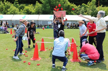 今回は療養のため、屋外に出る機会が少ない方もたくさん参加され、約150人の患者さんが笑顔を浮かべながらジンギスカンに舌鼓を打っていました。また、玉入れや○×クイズなどOT主催のレクリエーションも行われ、楽しいひとときを過ごされていました。