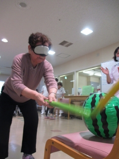いざ始まると、手を上げて「スイカ割りがしたい!」と自発的に参加する方が多く、スイカ割りにチャレンジしている患者さんだけではなく、その様子を見ている患者さんにも笑顔が見られ、楽し気に過ごされていました。