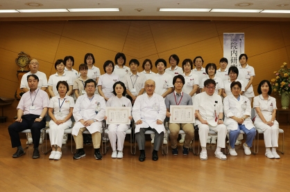 最優秀賞は「知的障がい者の一般就労に対する課題中心アプローチの有効性」を発表した就労支援センターピアチェーレの及川卓郎・作業療法士、優秀賞は「当院での嚥下調整食への取り組み」を紹介した若松紘美・管理栄養士が選ばれました。