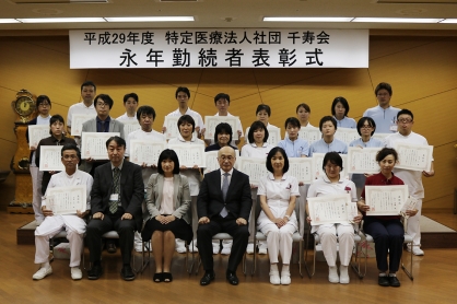 平成28年11月13日(月)に当法人の永年勤続表彰式を行いました。今年度の受賞者は30年と20年の勤続者が各3名、10年が17名の計23名となりました。千葉理事長はあいさつで長年の功労に謝意を表し、受賞者に表彰状と記念品を手渡しました。