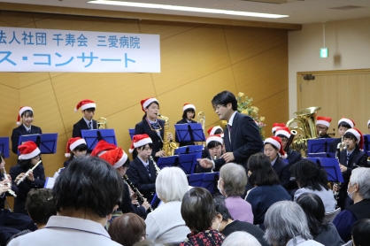 看護部レクリエーション委員会主催の「平成29年 三愛病院クリスマスコンサート」を12月7日(木)に開催しました。北海道大谷室蘭高等学校吹奏楽部のメンバー33人をお招きし、定番のクリスマスソング「サンタが街にやってくる」をはじめ、患者さんや利用者さんが慣れ親しんでいる「津軽海峡冬景色」や「上を向いて歩こう」など多彩なジャンル、合計8曲を演奏していただきました。