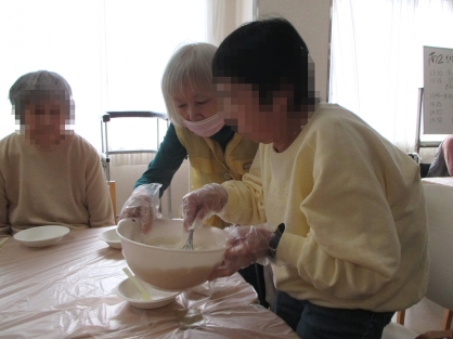 平成30年3月16日(金)に南館2階病棟で“ひなまつりレク”を開催しました。患者さんにはホットケーキの種作りから挑戦してもらい、バナナやイチゴといった果物のカットも行ってもらいました。自分たちで作ったホットケーキを笑顔で頬張り、「おいしいね」と交流する姿が見られ、楽しく過ごされていました。