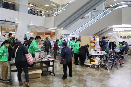 2日目は登別市中央町のショッピングセンターアーニスで看護部や栄養課、医療福祉相談室などのブースを設け、各種相談や測定をはじめ、手洗いチェッカー体験などを実施しました。また、デイケアや作業療法では患者さんが製作した手工芸作品の展示やプレゼントなどを行ったほか、ことぶき商事㈱で取り扱う介護用品の紹介、就労支援センター・ピアチェーレのパンの販売など、様々な活動を通して当院の役割をアピールさせていただきました。