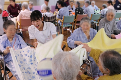 このうち西館棟2階病棟に配属となった生徒さん5名は、患者さんと一緒にOT主催のレクに参加。2人でバスタオルを持ち、ボールをバスタオルで隣の人に次々と渡していく競技を患者さんと一緒に楽しみ、少し緊張していた生徒さんにも笑顔が見られました。