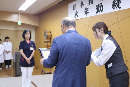 当院の納谷看護部長が公益社団法人日本精神科病院協会より「日本精神科病院協会永年勤続表彰」を授与されました。この賞は同協会の会員病院に30年以上勤務し、功績のあった職員に贈られます。