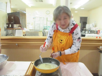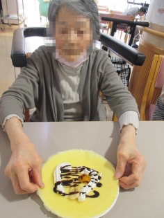 この後患者さんは、果物やクリームなど自由にトッピングして食べていました。調理をする機会が少ないので、作ることの楽しさも感じていただけたと思います。今後も楽しんでいただけるようなレクを企画していきます。