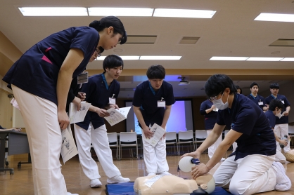 入社式後、3日間の日程で看護部新人看護職員研修スタートし、この日は「医療人としての心構え」などの講義やBLS(一次救命処置)やCVPPP(包括的暴力防止プログラム)といった実技研修を行いました。