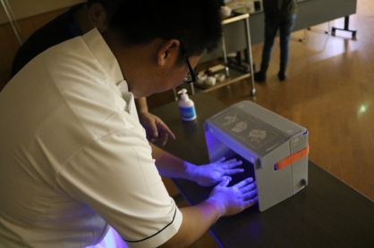 はじめに手に残った汚れを発見する手洗いチェッカーを体験した後、就労支援センター・ピアチェーレの手づくりパンや病院食を試食していただきました。この後、血圧測定、注射や採血、車椅子移動などを行い、病棟へ移動しました。